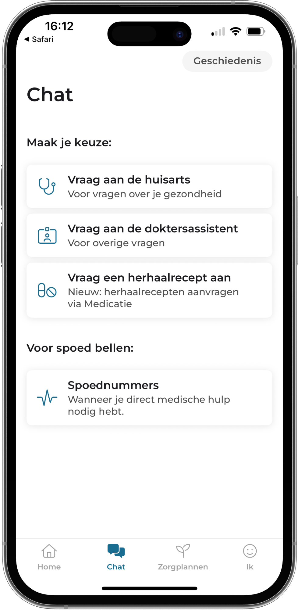 Je kunt in de Gezond.nl app starten met een huisarts of doktersassistent van Gezond.nl. Dit hangt af van de chat die je opent. Je kunt kiezen uit: